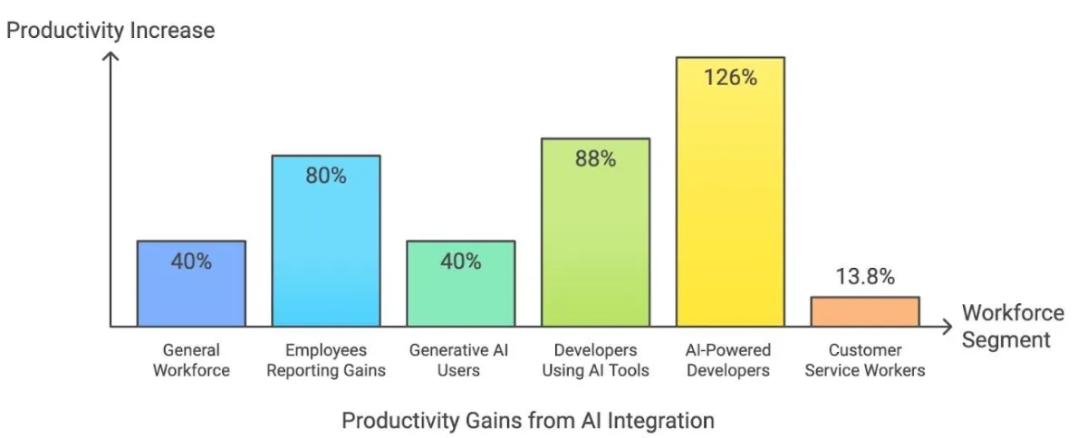 "AI powered developers complete 126% more projects weekly. Developers using AI tools see an 88% increase in productivity."